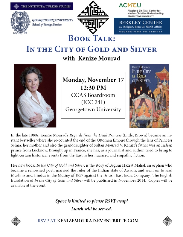 Her new book, In the City of Gold and Silver, is the story of Begum Hazrat Mahal, an orphan who became a renowned poet, married the ruler of the Indian state of Awadh, and went on to lead Muslims and Hindus in the Mutiny of 1857 against the British East India Company. The English translation of In the City of Gold and Silver will be published in November 2014. Copies will be available at the event.