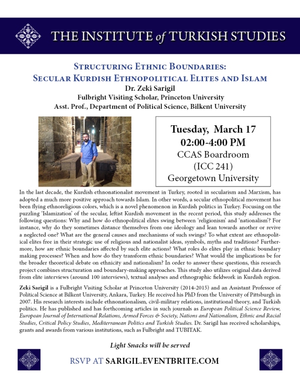 Zeki Sarigil is a Fulbright Visiting Scholar at Princeton University (2014-2015) and an Assistant Professor of Political Science at Bilkent University, Ankara, Turkey. He received his PhD from the University of Pittsburgh in 2007. His research interests include ethnonationalism, civil-military relations, institutional theory, and Turkish politics. He has published and has forthcoming articles in such journals as European Political Science Review, European Journal of International Relations, Armed Forces & Society, Nations and Nationalism, Ethnic and Racial Studies, Critical Policy Studies, Mediterranean Politics and Turkish Studies. Dr. Sarigil has received scholarships, grants and awards from various institutions, such as Fulbright and TUBITAK.