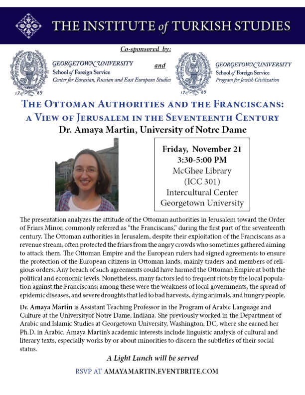 The presentation analyzes the attitude of the Ottoman authorities in Jerusalem toward the Order of Friars Minor, commonly referred as “the Franciscans,” during the first part of the seventeenth century. The Ottoman authorities in Jerusalem, despite their exploitation of the Franciscans as a revenue stream, often protected the friars from the angry crowds who sometimes gathered aiming to attack them. The Ottoman Empire and the European rulers had signed agreements to ensure the protection of the European citizens in Ottoman lands, mainly traders and members of religious orders. Any breach of such agreements could have harmed the Ottoman Empire at both the political and economic levels. Nonetheless, many factors led to frequent riots by the local population against the Franciscans; among these were the weakness of local governments, the spread of epidemic diseases, and severe droughts that led to bad harvests, dying animals, and hungry people.
