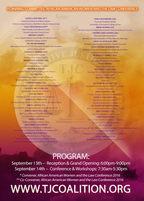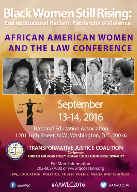 The Transformative Justice Coalition (TJC) and the African American Policy Forum/Center for Intersectionality and Policy Studies (AAPF/CIPS) have partnered to host the inaugural African American Women and the Law Conference National Legislative & Agenda Setting Convening in Washington, DC on September 13-14, 2016.