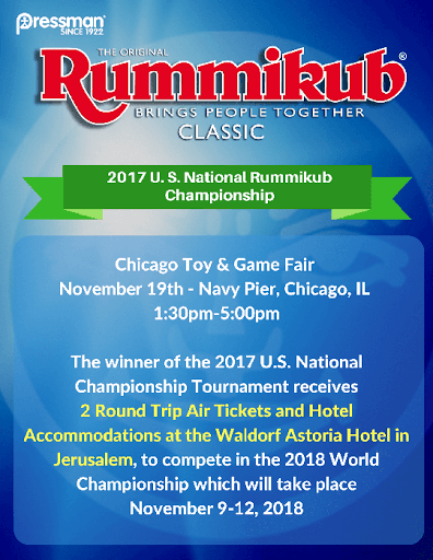 Entry for the U.S. National Championship Tournament is $25. All entrants receive admission to Chicago Toy & Game Fair and a Rummikub in Retro Tin game (combined package value $45.00). Additional tickets may be granted for friends and family members on an as-available basis.