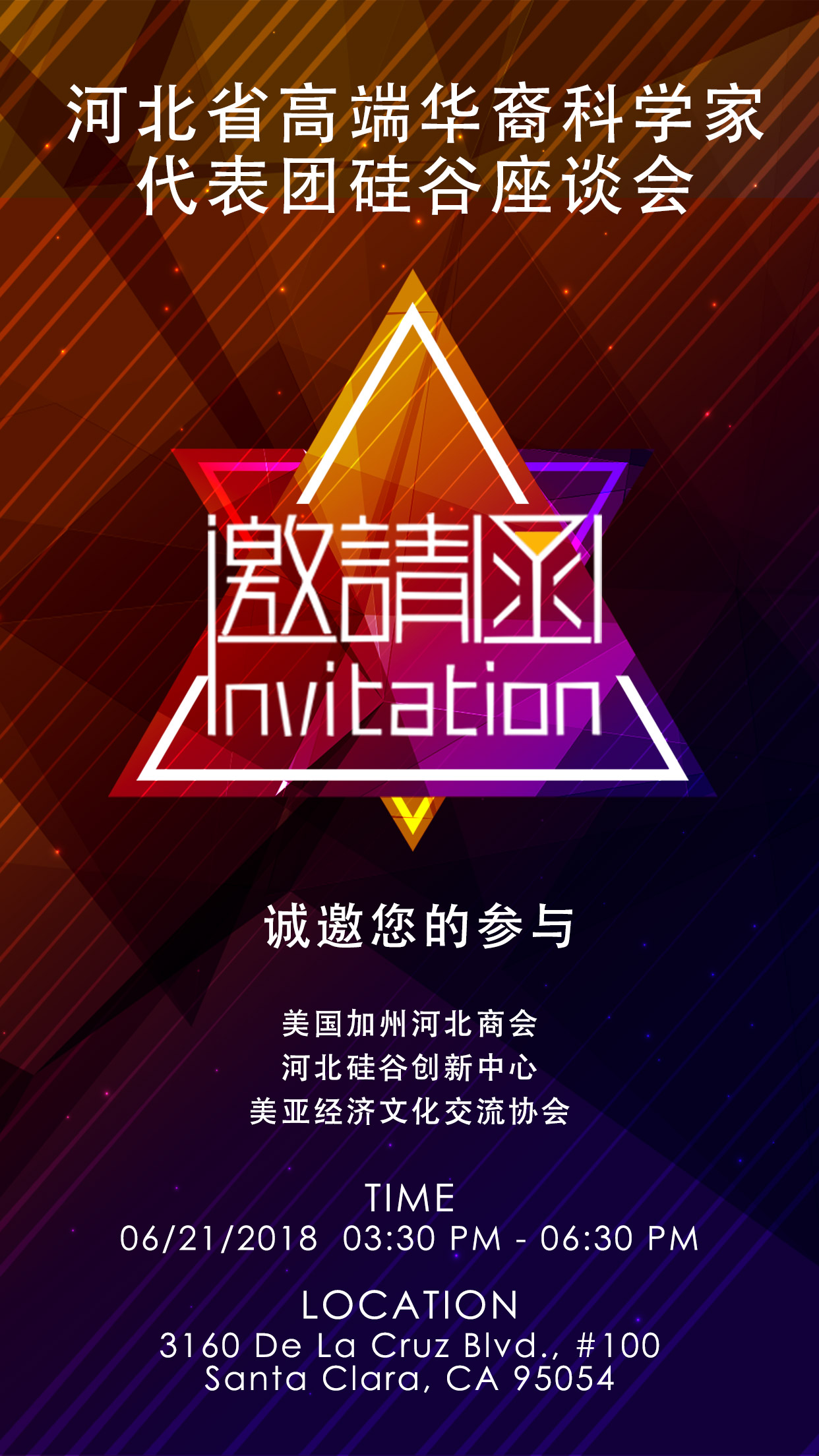 由河北省人社厅、河北省科技厅、河北省外专局、唐山市人社局、廊坊市外专局以及河北省著名企业家组成的河北省华裔高端专家引进代表团将于2018年6月20日访美,并于2018年6月21日下午3:30在河北硅谷创新中心召开项目座谈会。