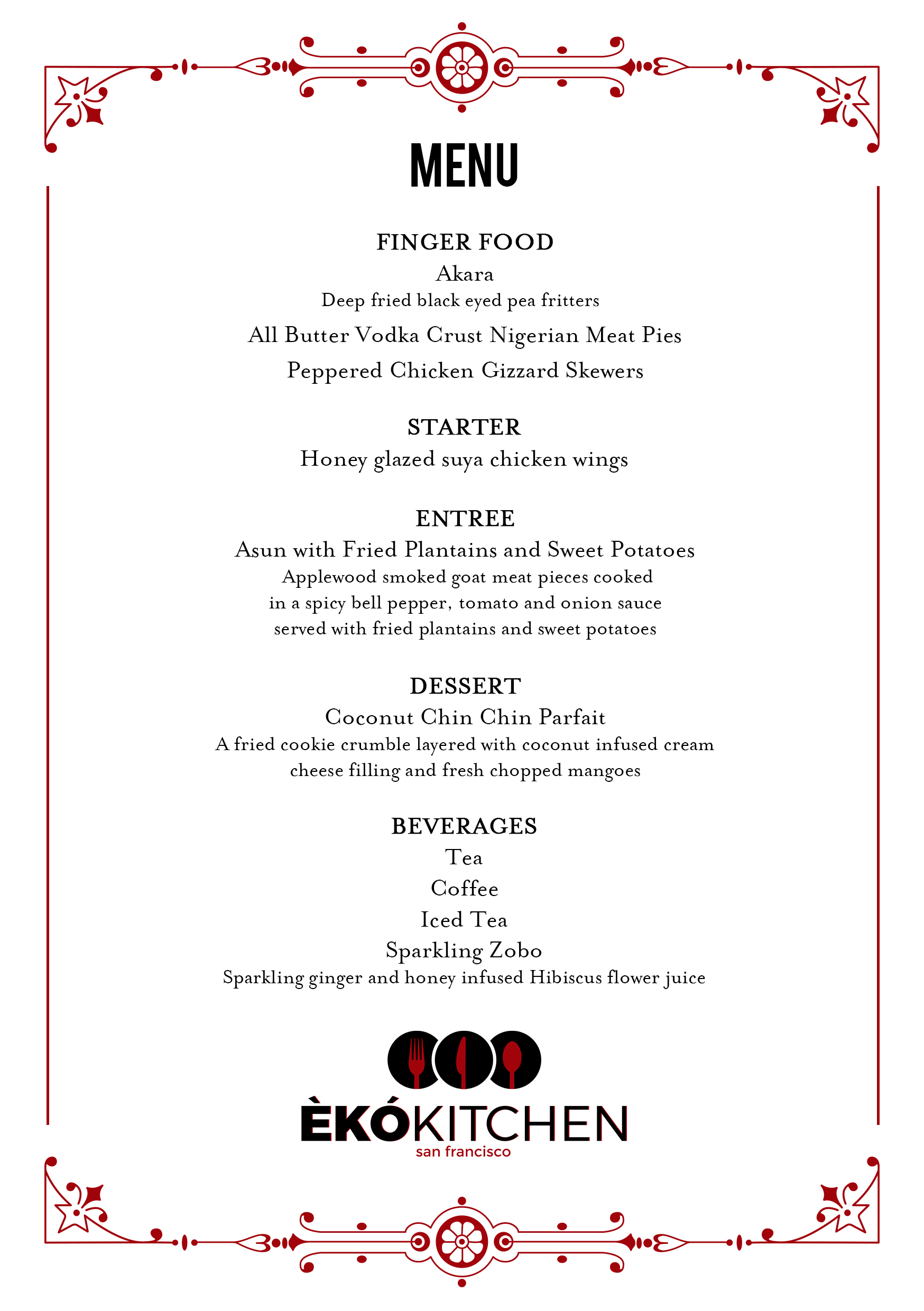 Guests will be served a family style meal curated by the Owner and Head Chef of Eko Kitchen, inspired by her home city of Lagos, Nigeria, her mother and two grandmothers' recipes, and her travels through Italy and Greece.