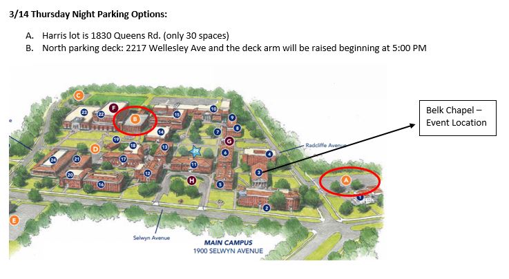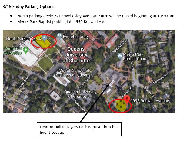 Please note the workshop check-in location has changed from Queens University of Charlotte, 1900 Selwyn Ave, Charlotte, NC 28207 to Belk Chapel, 2234 Radcliffe Avenue, Charlotte, NC 28207. No other event details have changed.