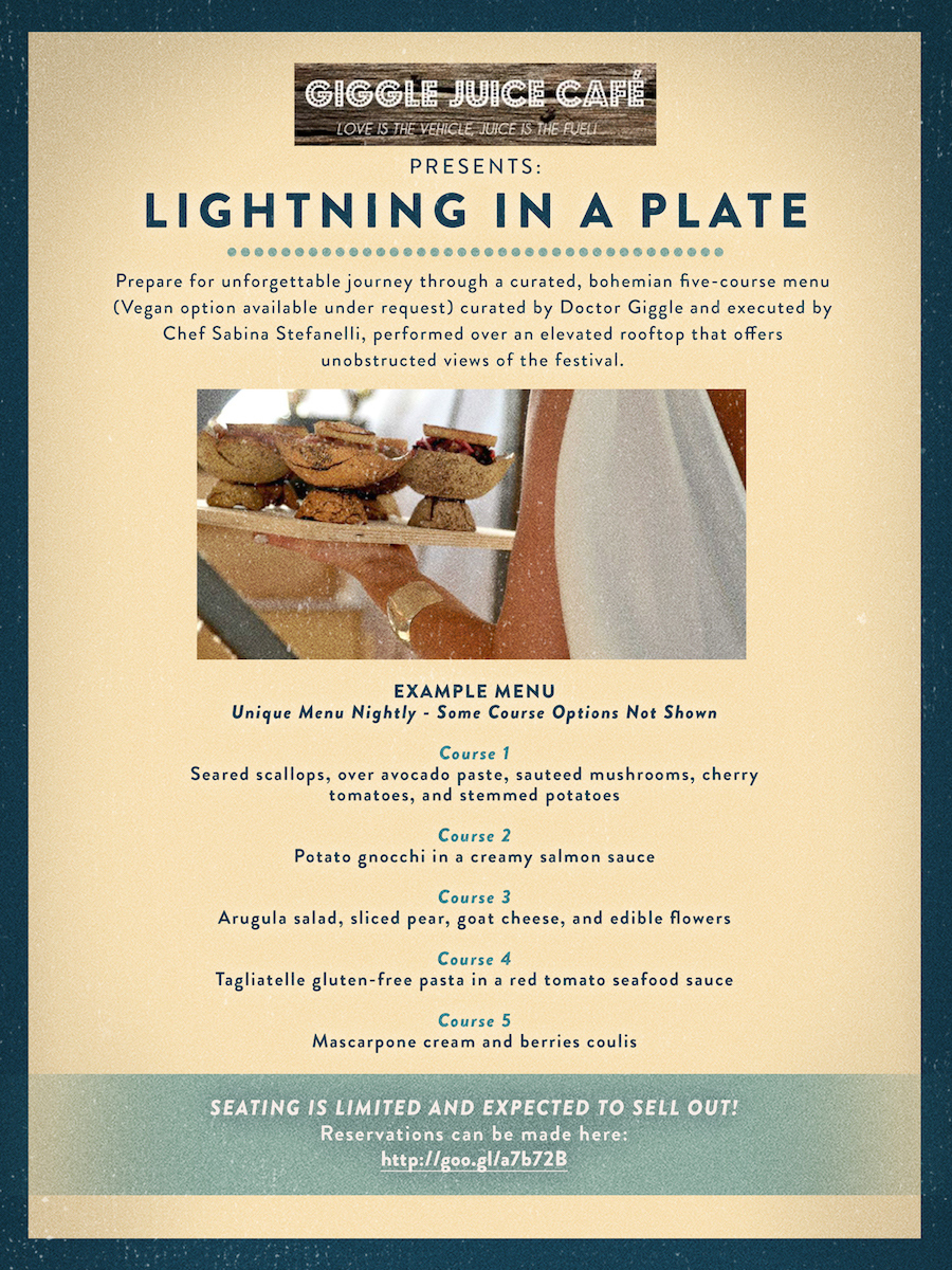 A unique oasis for the body and the mind presents Lightning in a Plate. Nightly, at both 6pm and 8pm come to the Thunder Stage Food Court for an immersive culinary experience, where dining is a bustling, boisterous celebration of food and meals are shared, eaten and considered a ceremony of nature, hard work and valued bonds with others, linking the importance of the concept to organic growing methods, sustainable living practices, and environmental awareness and sensibility. Guests will be transported on an unforgettable journey through a curated, bohemian five-course menu curated by Doctor Giggle and executed by Chef Sabina Stefanelli, performed over an elevated rooftop that offers unobstructed views of the festival. 20 guests per night.