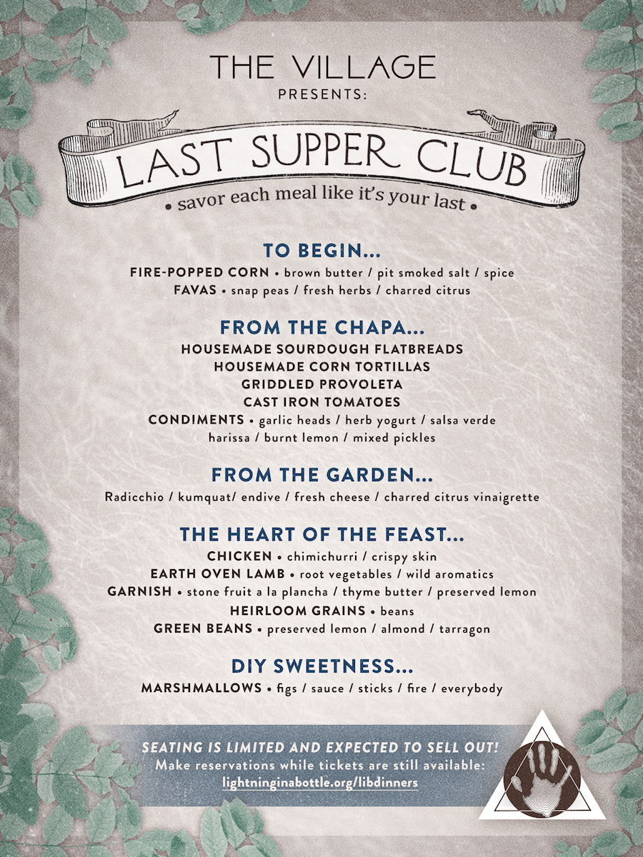 The Village is thrilled to invite you to our farm-to-festival theatrical fine dining extravaganza. Step across our threshold and find yourself in another world…where an eternal feast is fireside and you are always the guest of honor. A world where the food is made of poetry and the fire knows your name. A world where the deliciousness of being alive, together, is cause for wild celebration. A world where a reckless band of beautiful strangers have welcomed you into their revels.