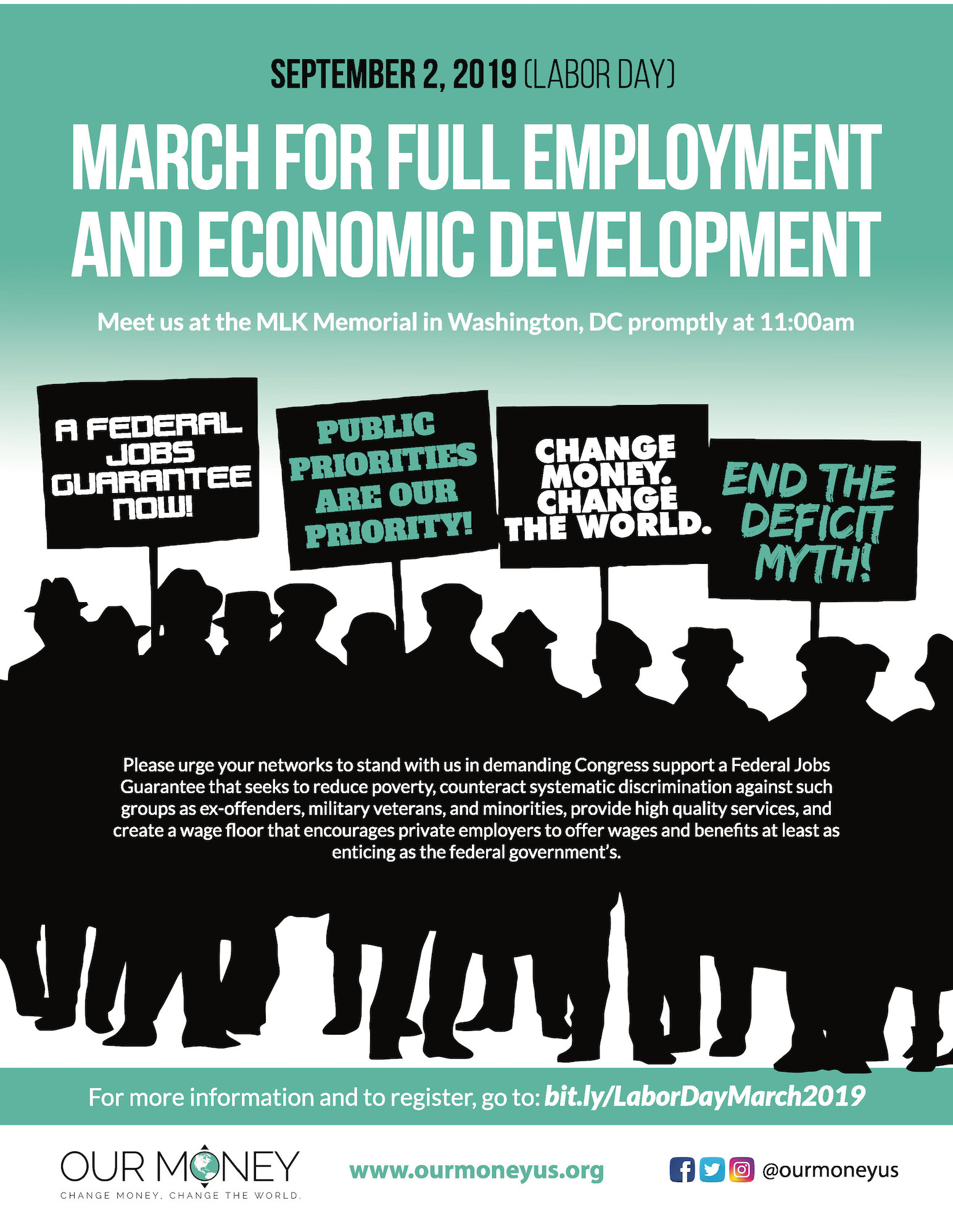 Carolina, we are still pressing and overcoming. Join us as we join the MARCH FOR FULL EMPLOYMENT AND ECONOMIC DEVELOPMENT in commemoration of 1963’s March on Washington for Jobs and Freedom alongside our friends Dr. Delman Coates and the Our Money Campaign. We are supporting their efforts to educate the community through issue-based advocacy and education through the Modern Monetary Theory (MMT).