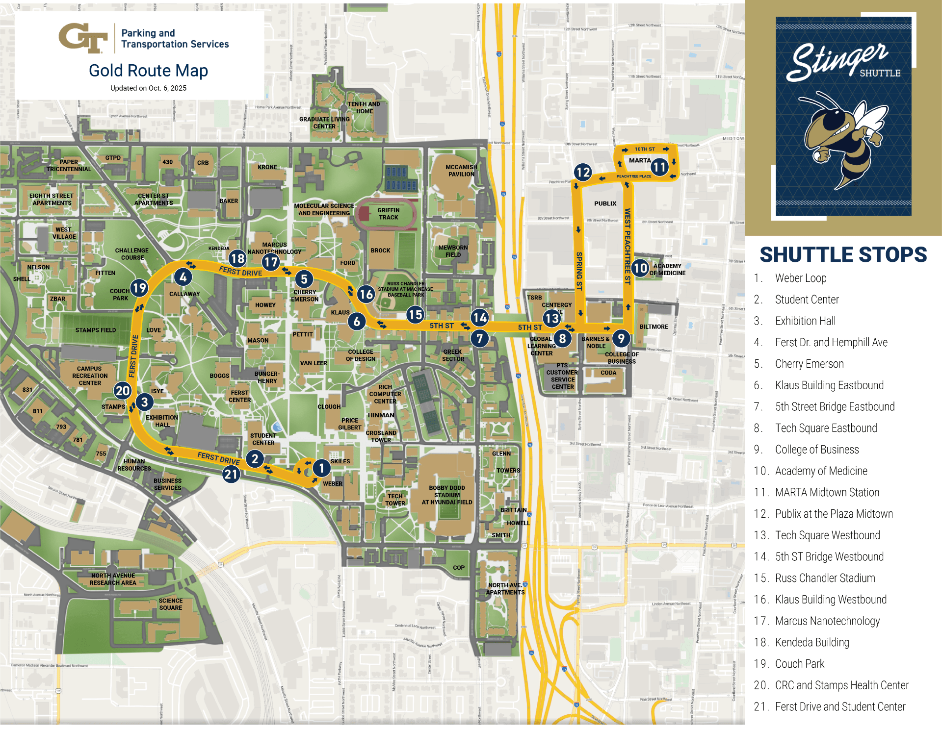 - Georgia Tech Stinger gold route bus service available from the 10th St Midtown MARTA station. Get out at the Klaus Building stop #16, and walk South to the College of Design. Route shown here.