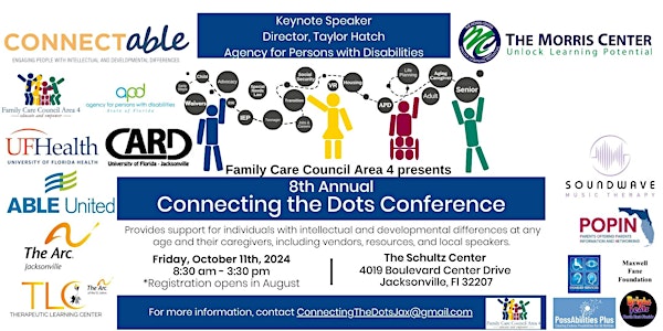 Registration has now closed. On-site registration is available until the venue reaches capacity. We look forward to seeing you on Friday, October 11th, 2024. Event Schedule 7:00 am - 7:45 am: Exhibitor/Presenter Check-In 8:00 - 8:50 General Admission check-in, Visit Exhibitors (Continental Breakfast offered by Bitty & Beau's) 8:50 Call for Exhibitors & Attendees to take seats in Gentry A/B 8:55 Exhibitor Area Closed 9:00 Welcome to the 8th Annual Connecting the Dots Conference (Special Awards Ceremony for FCC Champions) 9:30 - 10:15 Keynote, Director Taylor Hatch, APD 10:15: Exhibitor Area Reopens 10:15 - 10:30 Questions/Photos with Director Hatch 10:35 - 11:30 Breakout session A 11:40 - 12:35 Breakout Session B 12:35 - 1:45 Viewing of "Unseen" courtesy of UF Health Jacksonville CARD, in room 162/163 (Those interested in the viewing can pick up lunch early, Viewing begins at 12:45) 12:45 - 1:45 Lunch (Berry Good Farms of North Florida School) & Visit Exhibitors 1:50 - 2:45 Breakout Session C 2:45 - 3:30 Visit Exhibitors 3:30 - 4:00 Exhibitor Breakdown/Cleanup Direct volunteer related questions to Volunteer Coordinator, Alana Leath at Alana.Leath@jax.ufl.edu