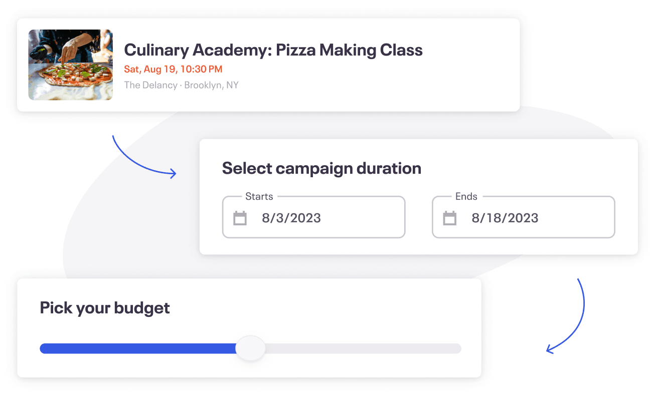 Pick a goal for your ad, like maximizing your reach or driving more clicks to your event, and our platform will automatically optimize for the best results.