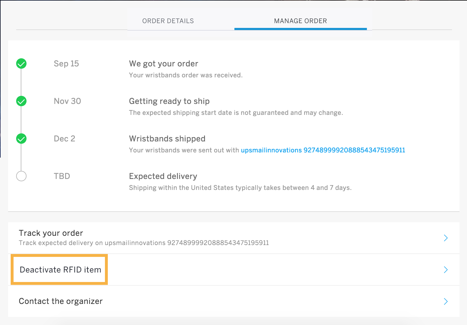 TIP: If your order hasn't shipped yet, you can still eblink{update your shipping address=>https://www.eventbrite.com/support/articleredirect?anum=8423} or eblink{cancel your wristband shipment and request Will Call pickup=>https://www.eventbrite.com/support/articleredirect?anum=17571}.